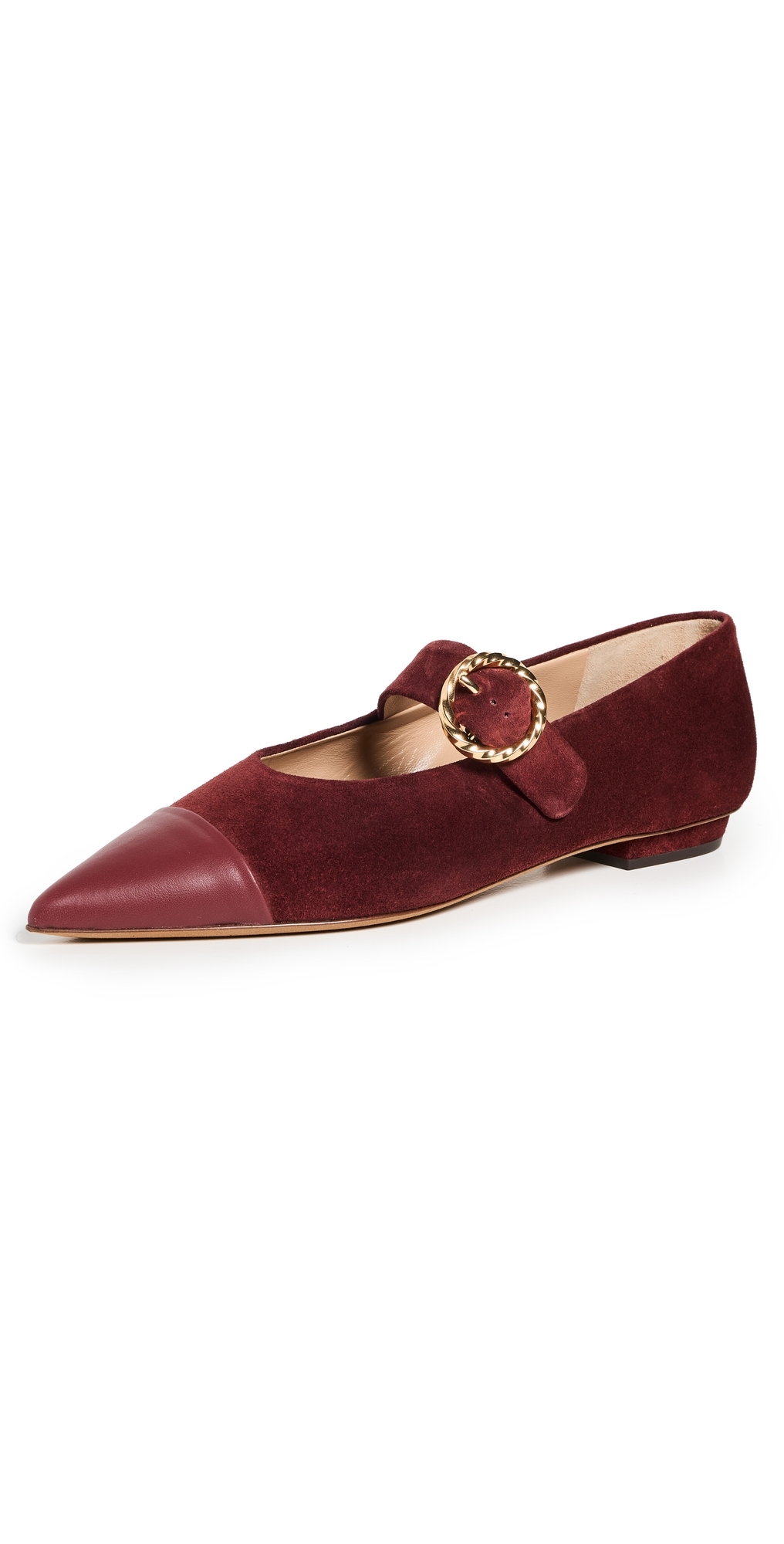 Upper: Calfskin. Lining: Leather. Suede finish. Gold-tone hardware. Pointed toe in nappa leather. Buckle ankle strap. Leather sole with rubber patch. Made in Italy. This item cannot be gift-boxed.