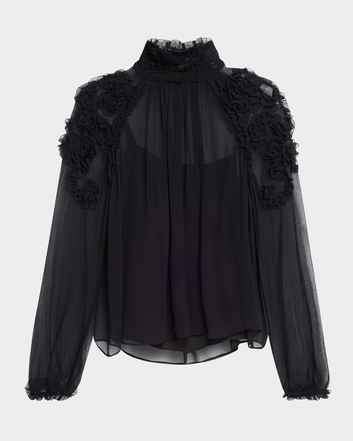 Ulla Johnson "Magdalena" luxurious silk blouse elevated with smocking and ruffles Turtleneck Long raglan sleeves Classic fit Hem falls to the hip Pullover style Silk Dry clean Imported