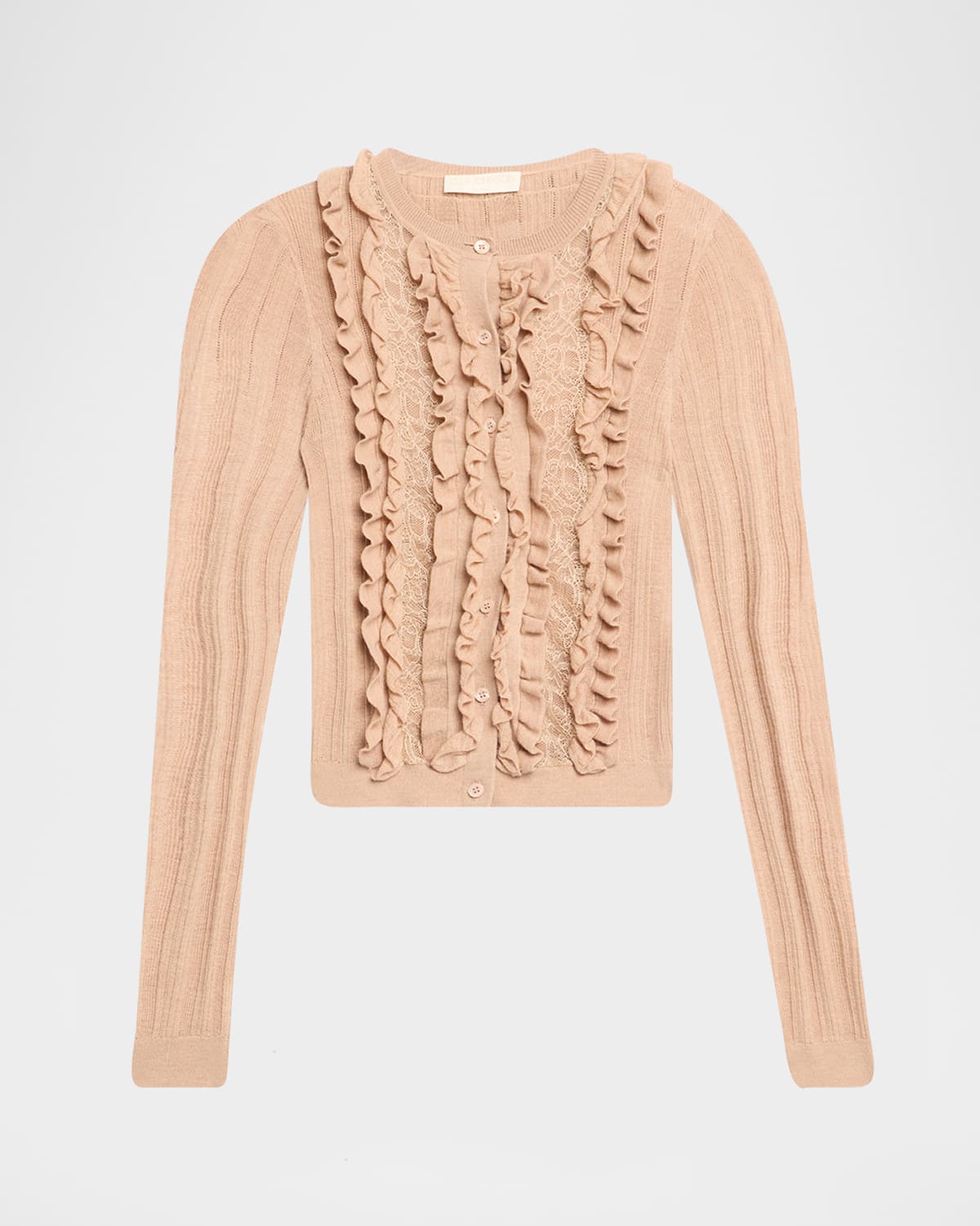 Finished with a softly ribbed texture, the "Maryel" cardigan by Ulla Johnson features front sheer lace panels and cascading ruffles. Crew neckline Long sleeves Slim fit Hip length Button front closure Merino wool/cotton Dry clean Imported