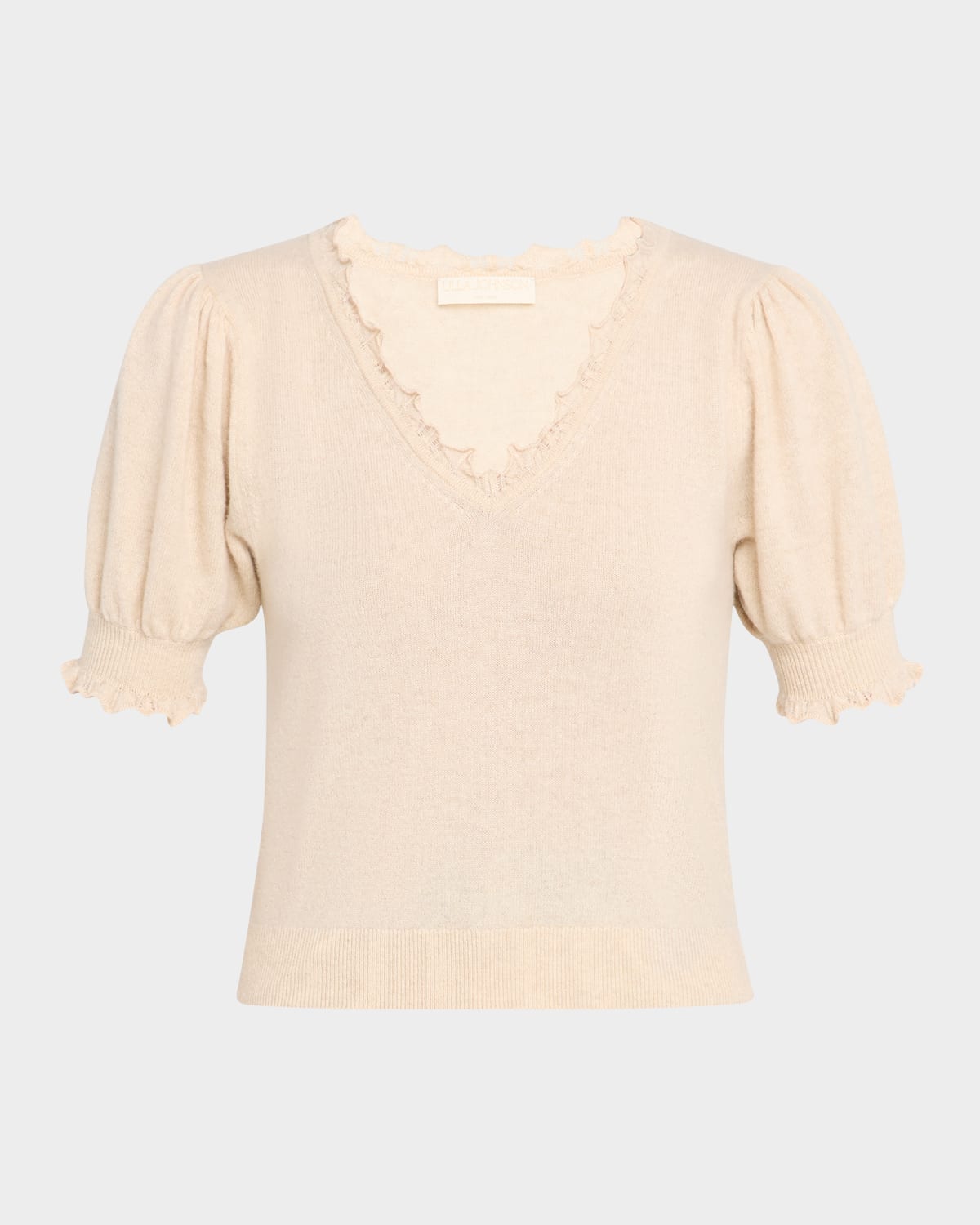Crafted in luxurious cashmere, the "Polline" sweater by Ulla Johnson is finished with frilled trim for a soft, feminine silhouette. V neckline Short sleeves Classic fit Hem sits at the hip Pullover style Cashmere Dry clean only Imported