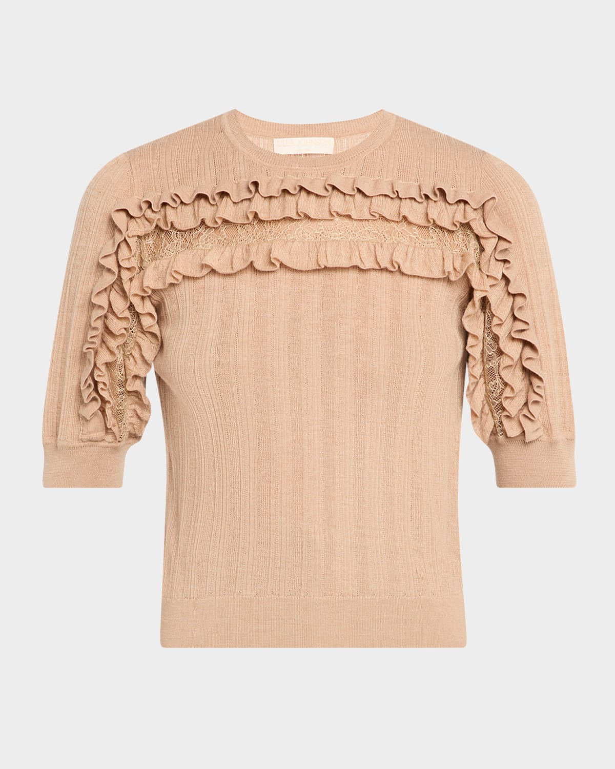 Ulla Johnson "Salima" lightweight merino knit shirt with ruffle detailing Crew neckline Short sleeves Classic fit Hem sits at the hip Pullover style Merino wool Imported