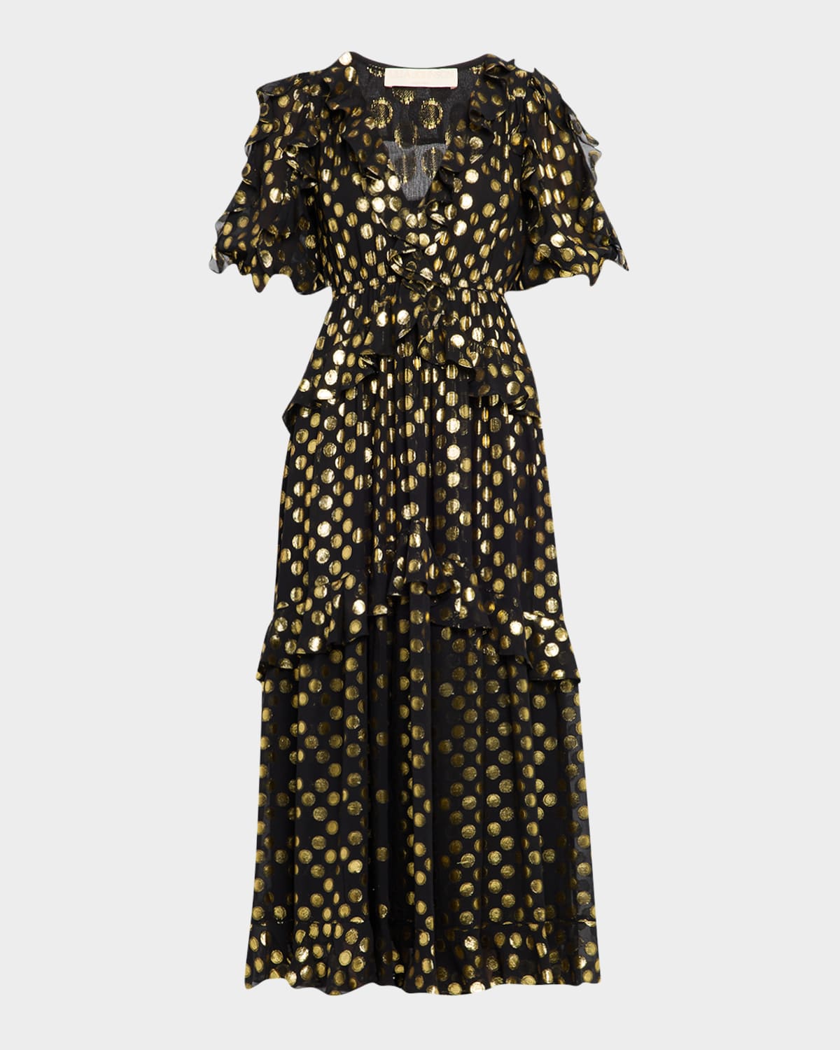 Cut from lurex fil coupé and accented with shimmering gold polka dots , the "Tida" dress by Ulla Johnson is accented with cascading ruffles for a showstopping silhouette. V neckline Short sleeves Side pockets Aline silhouette Hem falls below the knee Slipover style Silk/polyester Dry clean only Imported