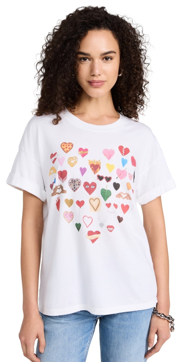 Fabric: Lightweight jersey. Distressed edges and fixed cuffs. Heart graphics at front. Crew neck. Short sleeves. Shell: 100% cotton. Wash cold. Imported, Guatemala. Measurements: Measurements from size S Length: 24.5in / 62.0cm, from shoulder
