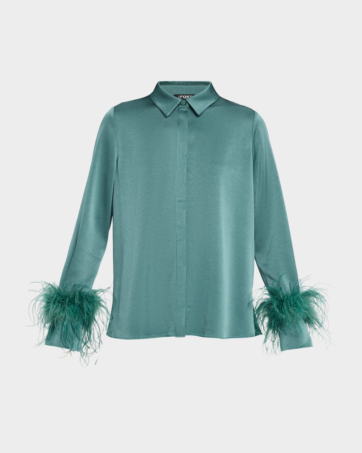 Cut from satin back crepe, this Ungaro "Luna" blouse flutters with ostrich feather trim along the cuffs Point collar Concealed button front Long sleeves Button cuffs Back inverted pleat Relaxed fit Triacetate/polyester/feather Imported
