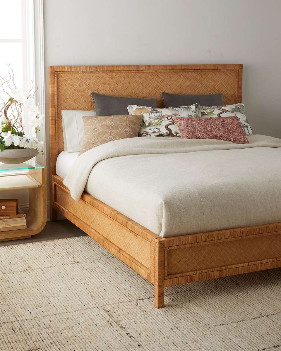 Invite casual composure into spaces with the Long Key Bed, a stunning bed crafted with layers of natural rattan and raffia displayed in a series of striking angles. Handcrafted of rattan, raffia, and engineered hardwood Overall, approx. 65"W x 86"D x 54"T Height from floor to box spring bottom: 8" Footboard height: 17" Assembly required; includes hardware Weight, 119.0 lbs Imported Boxed weight, approximately 151.0 lbs