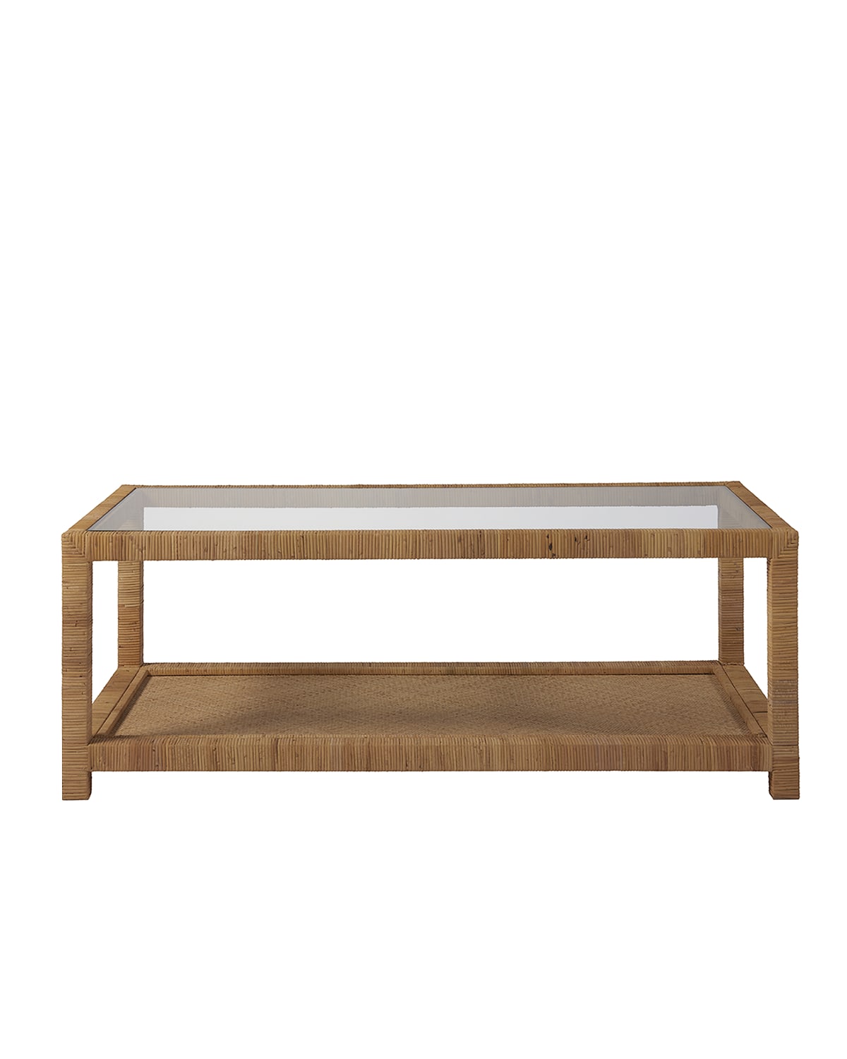 Handcrafted cocktail table. Wrapped split rattan. Glass top. Open display shelf. 50"W x 24"D x 18"T. Imported. Boxed weight, approximately 73 lbs.