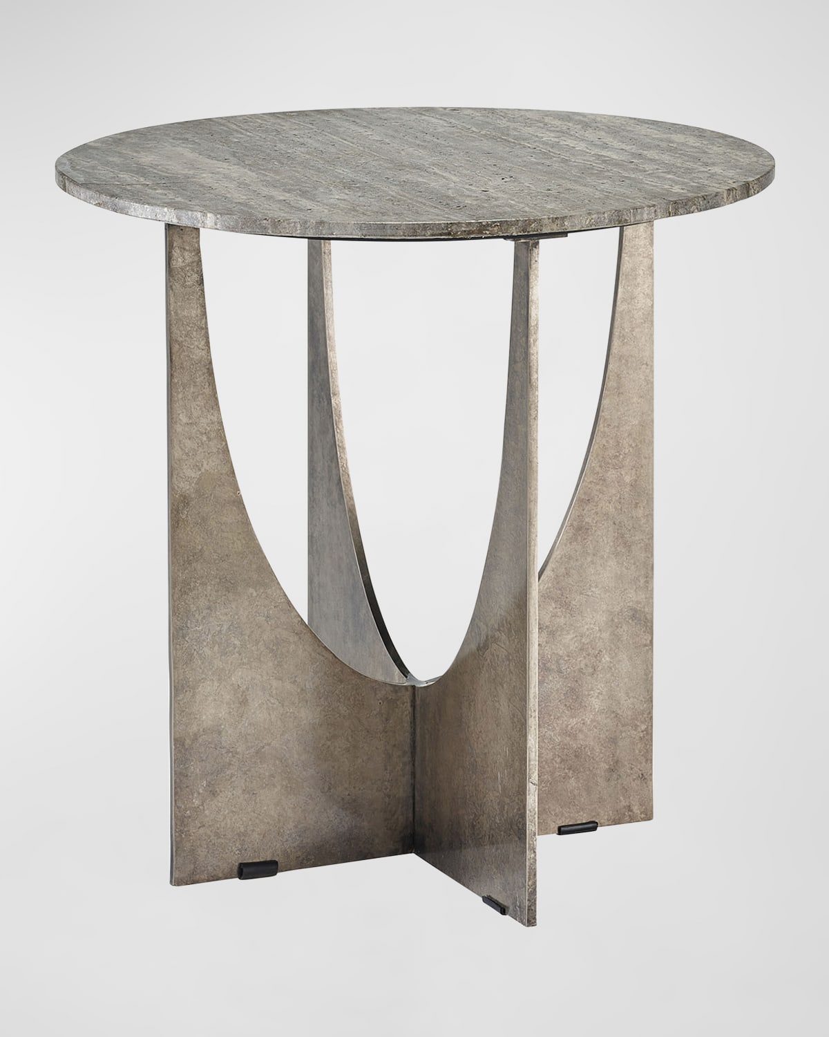 Punctuate sofas and accent chairs with the unique Op Art End Table, an opticallyinspired piece showcasing a forwardthinking juxtaposition of curved and linear edges finished in a dynamic, bronzed hue. Handcrafted of travertine and pewter Overall, approx. 24"Dia. x 24"T Finished back Wipe clean Weight, 69.0 lbs Imported Boxed weight, approximately 89.0 lbs