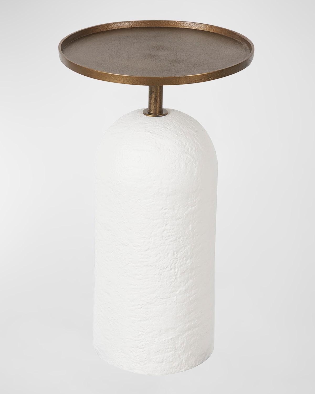 The Sienna Martini Table stands as a testament to modern elegance, featuring a sculptural white plaster base that contrasts beautifully with its sleek, cast aluminum top. This piece is the epitome of chic functionality, offering a stylish surface for beverages or enhancing a space with its sophisticated aesthetic charm. Handcrafted of cast aluminum and plaster Overall, approx. 12"Dia. x 21"T Finished back Wipe clean Weight, 18.0 lbs Imported Boxed weight, approximately 25.0 lbs