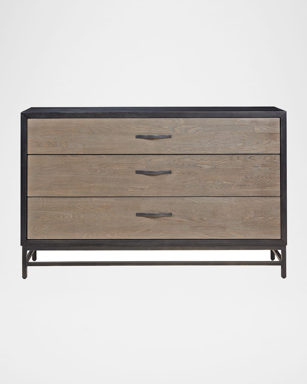 Dresser with three drawers. Elm veneers. Metal base and trim. 56"W x 18"D x 35"T. Imported. Boxed weight, approximately 176 lbs.