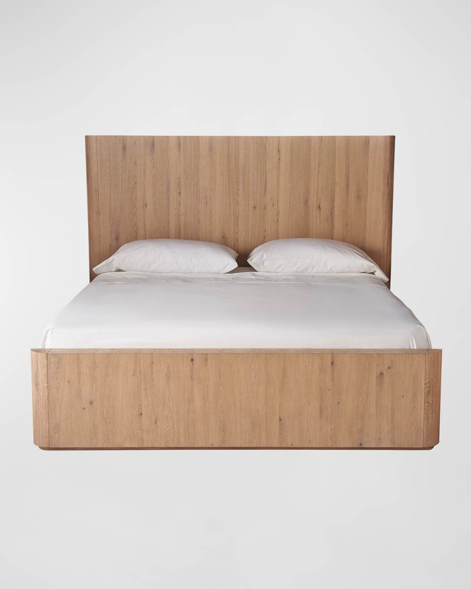 The Walker Panel Bed is a celebration of natural beauty, crafted in an organic natural oak finish that highlights the wood's inherent knotting and unique markings. Its fully wooden silhouette and extra tall headboard exude a sleek yet organic allure, inviting admiration for the raw elegance and intricate patterns bestowed by nature. This bed merges minimalist design with the warmth of natural elements, creating a serene and grounded bedroom atmosphere. Handcrafted of oak wood Overall, approx. 89"W x 90"D x 62"T Assembly required; includes hardware Finished back Wipe clean Weight, 281.0 lbs Imported Boxed weight, approximately 321.0 lbs