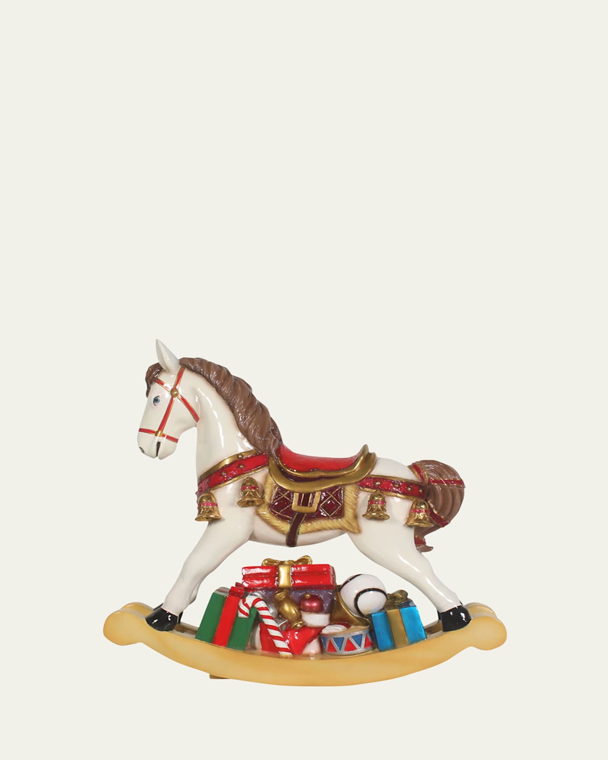 A decorative rocking horse adorned with festive gifts, combining equestrian elegance with holiday cheer. Whether it's used as a festive decoration in your own home or as a gift for someone special, a rocking horse with gifts adds a touch of holiday charm and warmth to your seasonal decor. Made of fiberglass and resin Approx. 36.22"L x 7.9"D x 35.8"T Item Weight (Lbs.): 44.0 For indoor and outdoor use Imported