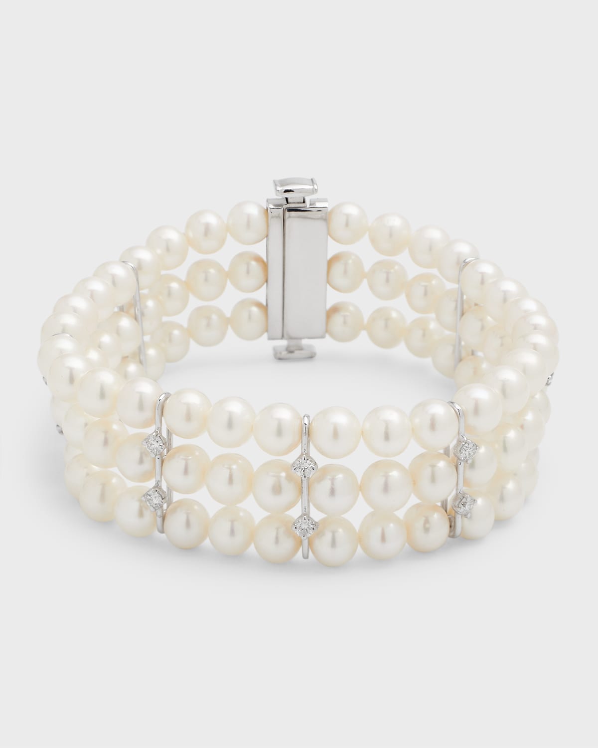 Utopia stacked bracelet Polihed 18karat white gold White diamonds in prong settings Naturally white freshwater cultured pearls Pearl dimensions: approx. 6mm 6.5mm Clasp is decorated with diamonds 1.0 total diamond carat weight Pushlock closure Made in Italy