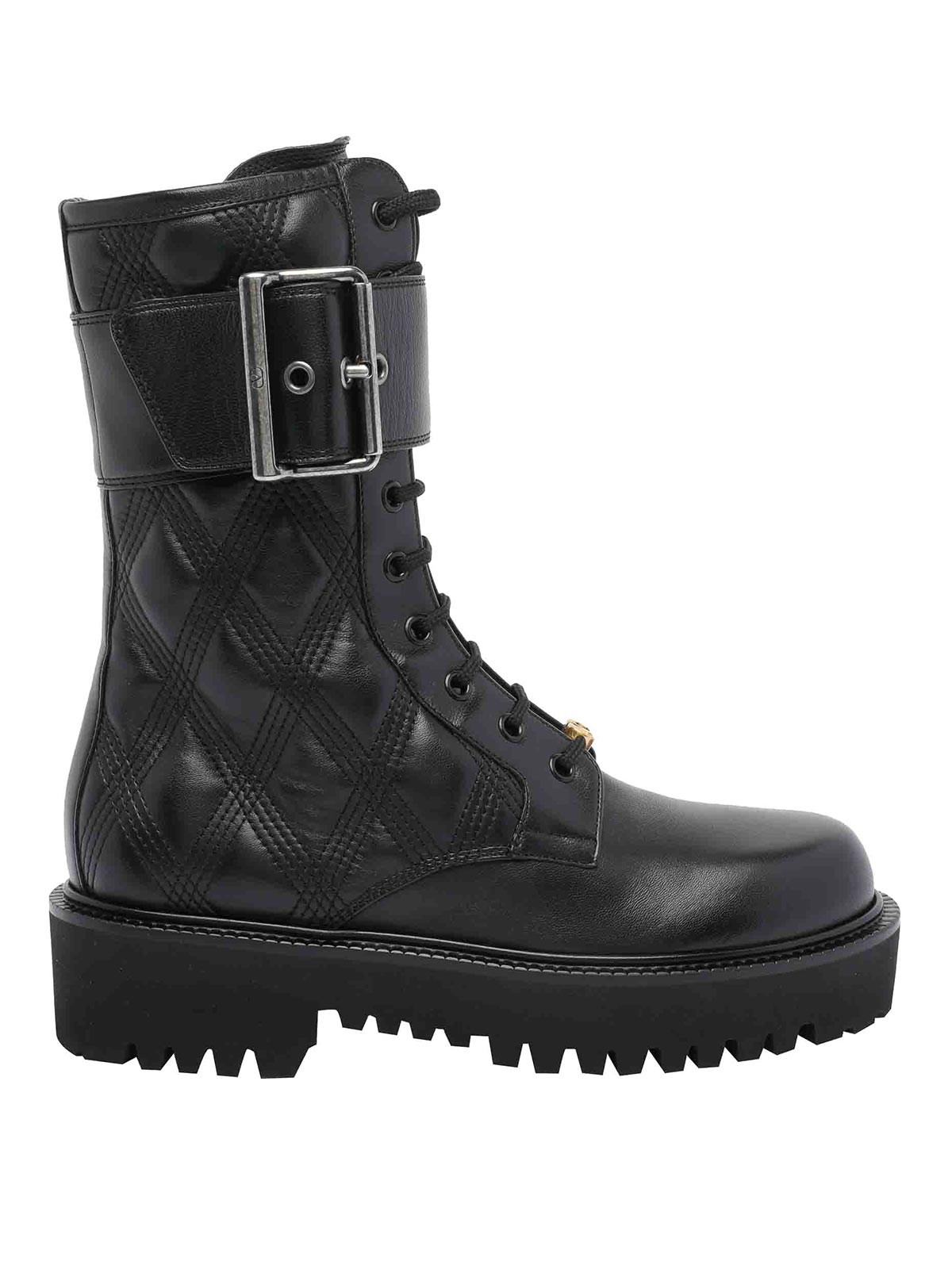 Bottines de combat Valentino Garavani noires à bout rond, modèle matelassé, boucle latérale, lacets, nom du créateur: noir