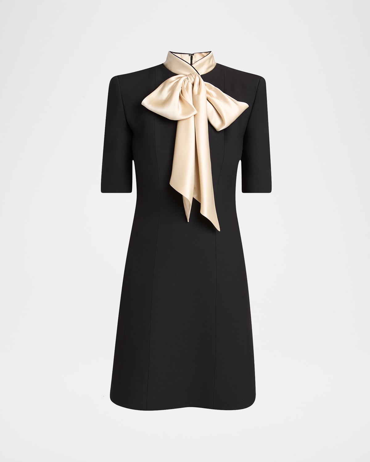 Tailored with bodycontouring seaming and framed with lightly padded shoulders, this structured mini dress by Valentino Garavani features an oversized contrasting satin bow Stand collar Padded shoulders Elbowlength sleeves Hem falls above the knee Aline skirt Invisible back zipper Virgin wool/silk Made in Italy
