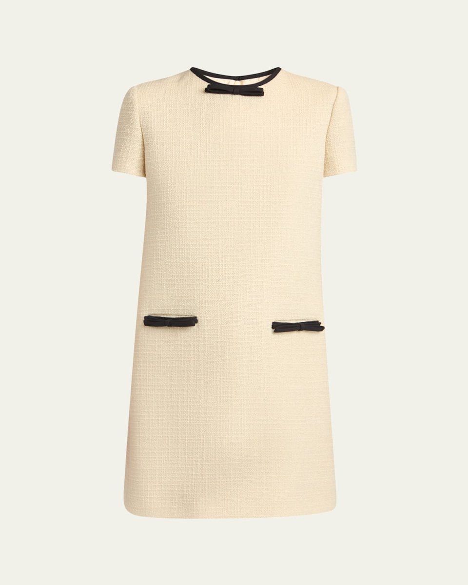 Designed in a chic, 60sinspired silhouette, this mini dress by Valentino Garavani is made from woolblend tweed and accented with contrasting bow details Crew neckline Short sleeves Hem falls above the knee Shift silhouette Invisible back zipper Virgin wool/nylon/polyamide Made in Italy