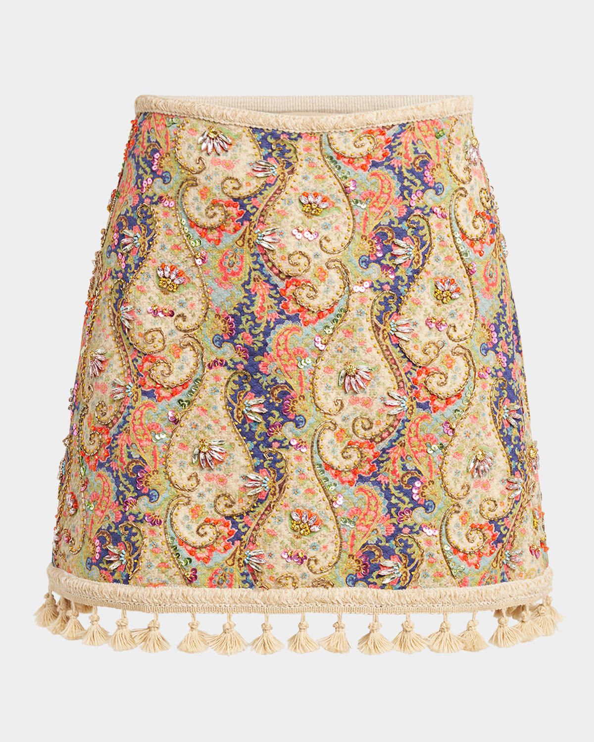 Valentino Garavani mini skirt crafted in swirling floralprint piqué with tasseled hem Adorned with sequins, crystals, and swirling beads Sits high on the hips Hem falls above the knee Aline silhouette Invisible side zipper Cotton Lining: Acetate/silk Made in Italy