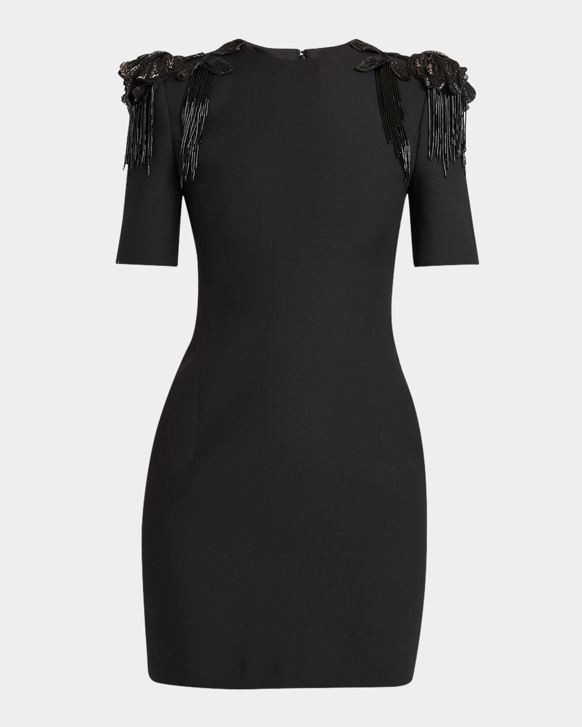 Embroidered Strong-Shoulder Crepe Mini Dress