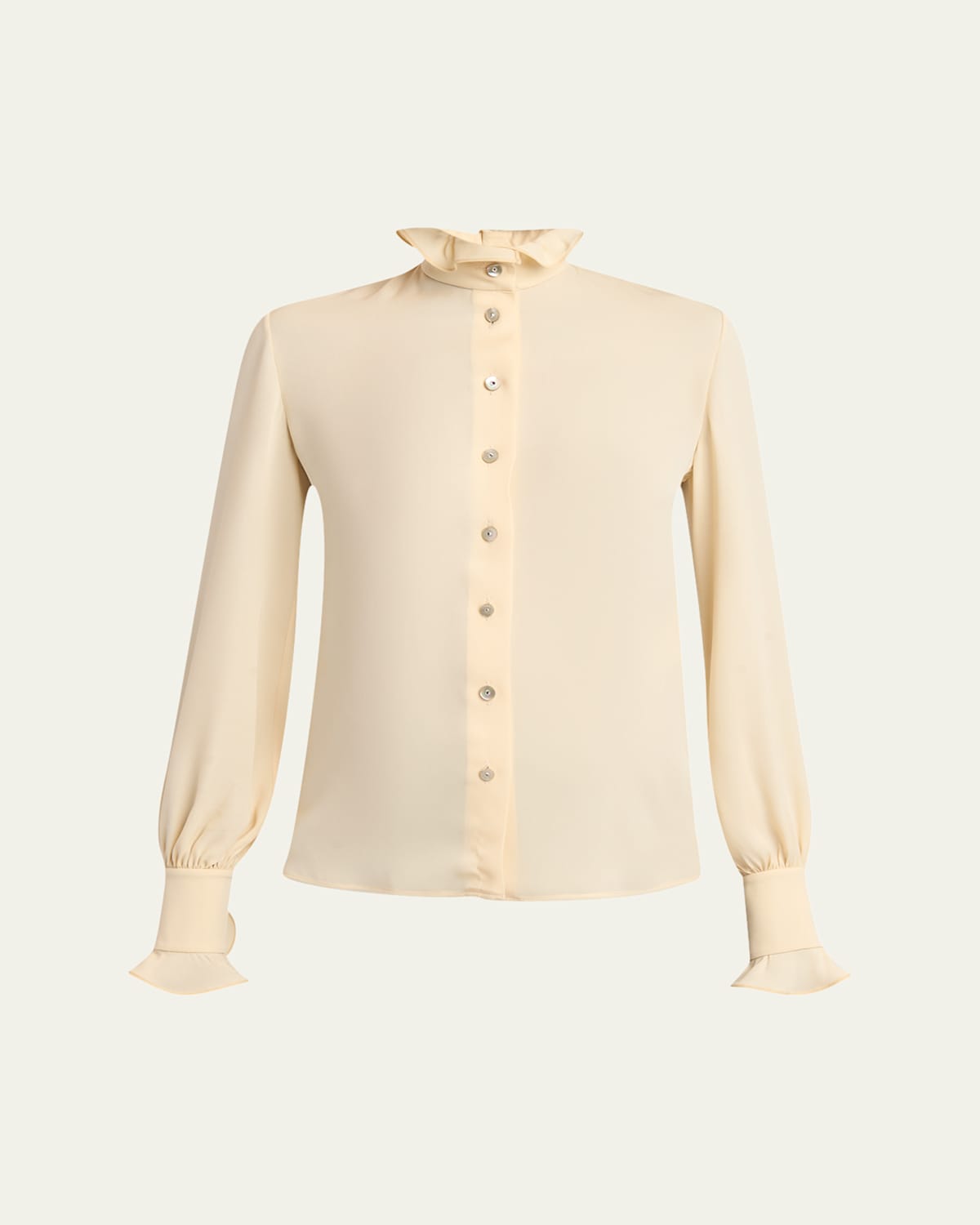 Designed in lightweight georgette, this blouse by Valentino Garavani features a ruffled collar and coordinating cuffs High neckline Long sleeves; button cuffs Relaxed fit Hip length Button front closure Silk Made in Italy