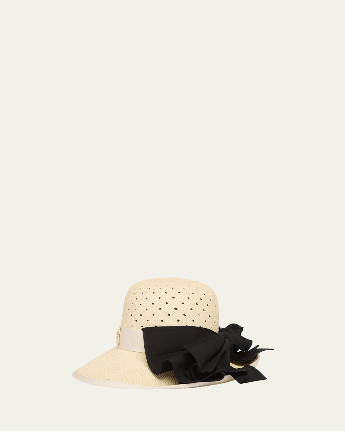 Valentino hat with a large brim and contrast bow accent Features signature Vlogo Round crown Band at break Virgin wool/silk/leather Made in Italy