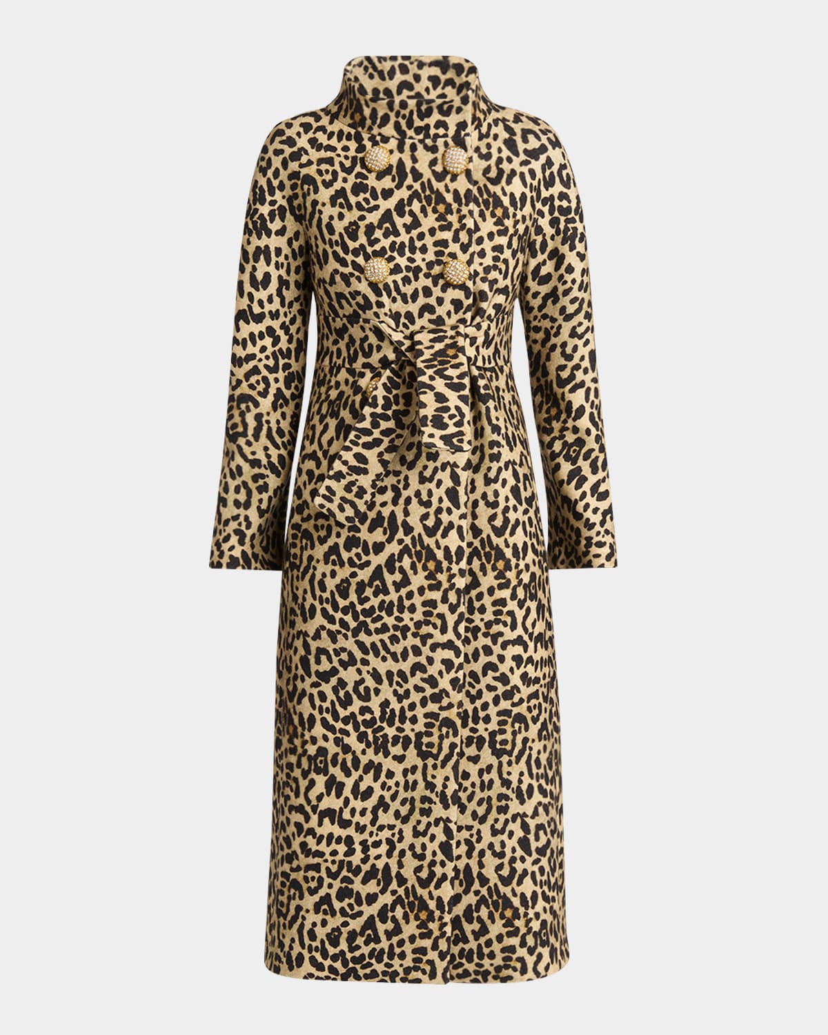 Valentino Garavani leopard printed wool coat featuring crystal encrusted buttons and an attached waist belt Stand collar; doublebreasted front Long sleeves Selftie belted waist Side slip pockets Straight fit Hem falls below the knee Button closure Wool Lining: Acetate/silk Made in Italy