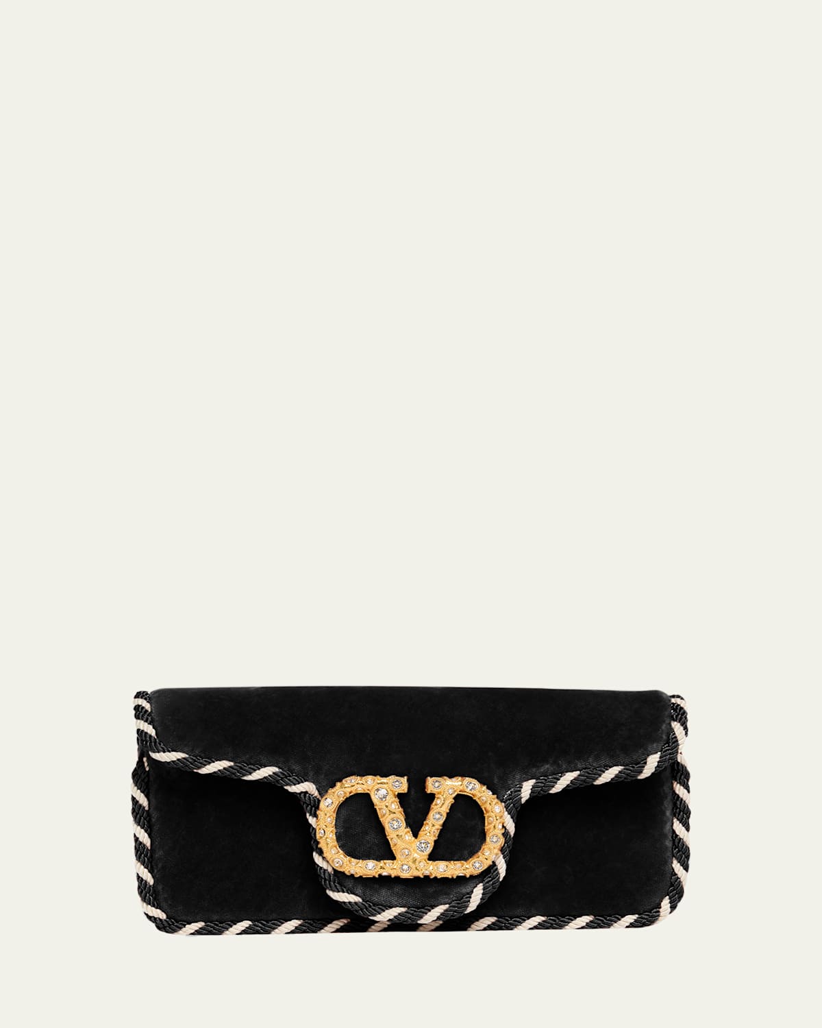 Valentino Garavani "Loco" clutch bag in velvet fabric with cord trim Detachable chain shoulder strap Can be worn as a clutch or shoulder bag Flap top with embellished VLOGO accent; magnetic closure Interior, one slip pocket Approx. 3.9"W x 8.3"H x 2"D Acetate/polyester Made in Italy