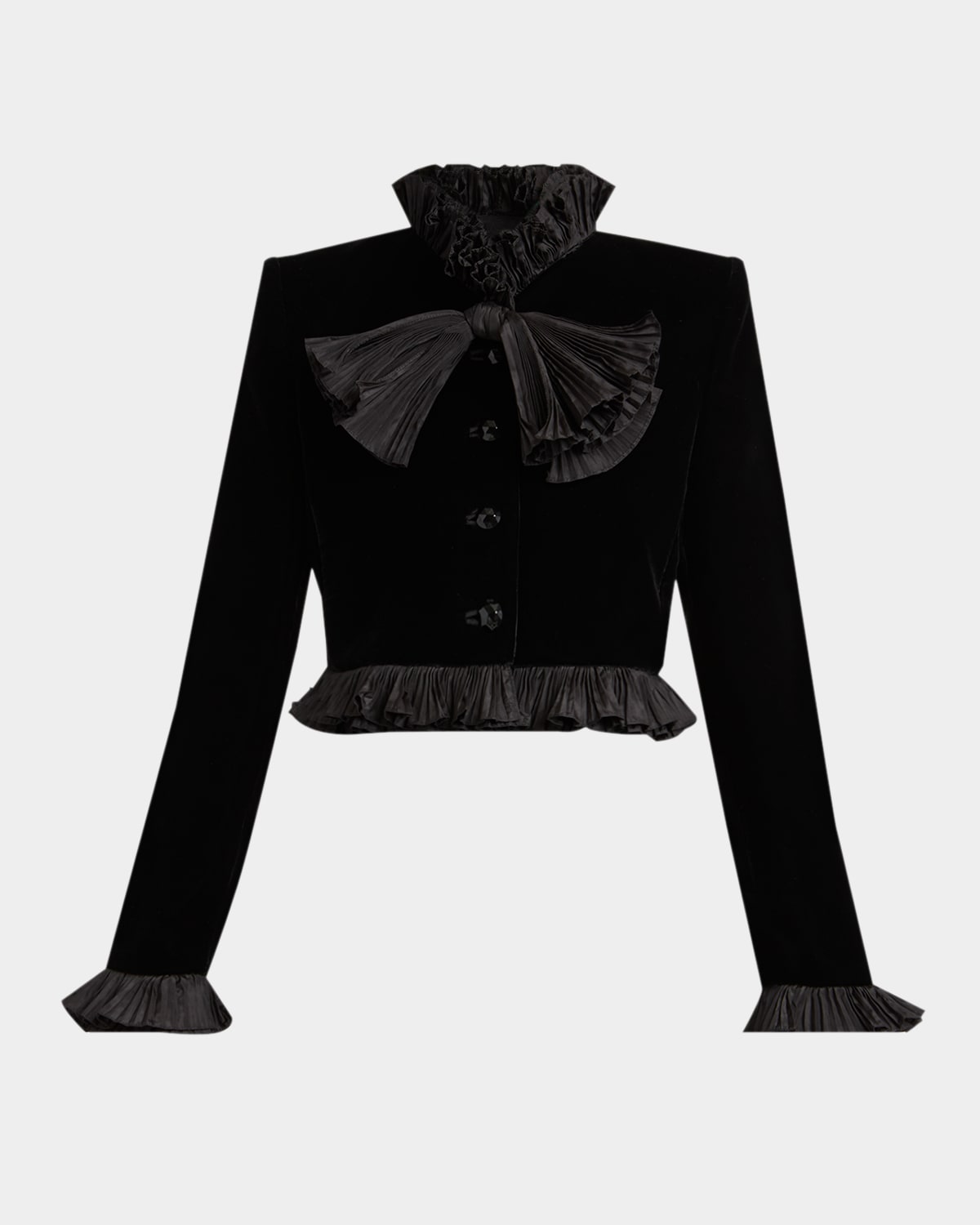 Valentino Garavani velvet jacket featuring pleated silk ruffles and a bow neck Stand collar; singlebreasted front Long sleeves; button cuffs Padded shoulders Straight fit Cropped length Silk Made in Italy