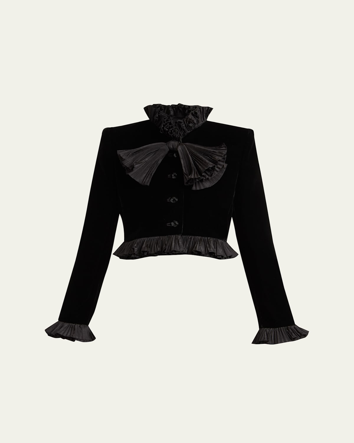 Valentino Garavani velvet jacket featuring pleated silk ruffles and a bow neck Stand collar; singlebreasted front Long sleeves; button cuffs Padded shoulders Straight fit Cropped length Silk Made in Italy