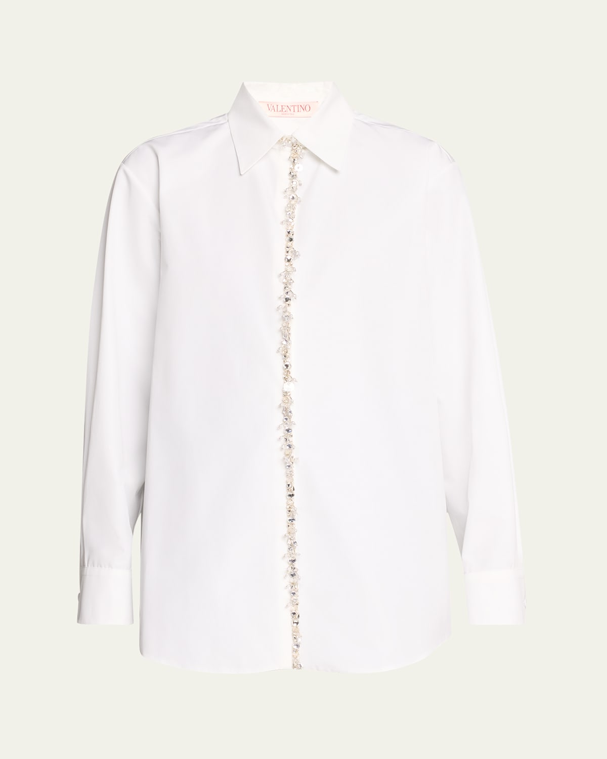 Valentino Garavani buttonfront poplin shirt features crystal embellished detailing at the placket Spread collar Concealed button front Long sleeves Back yoke; pleated Midlength Relaxed fit Cotton Made in Italy