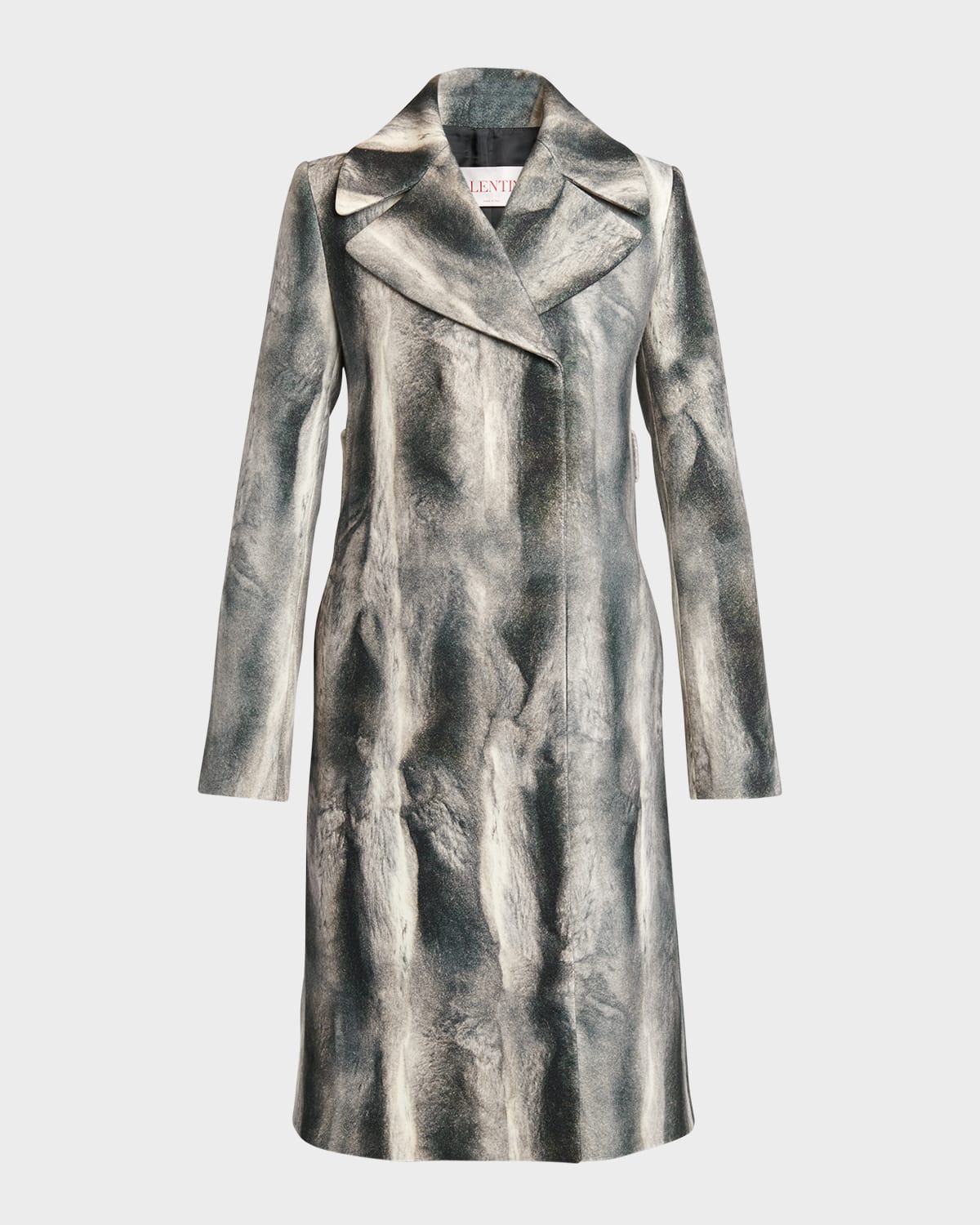 Printed Faux Fur Double-Breasted Belted Wool Coat