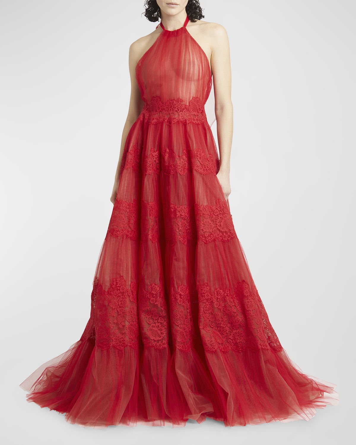 Valentino Garavani sheer tulle gown with lace panels Halter neckline; openback Sleeveless Aline silhouette Hem pools floor Back zip Nylon/polyamide Made in Italy