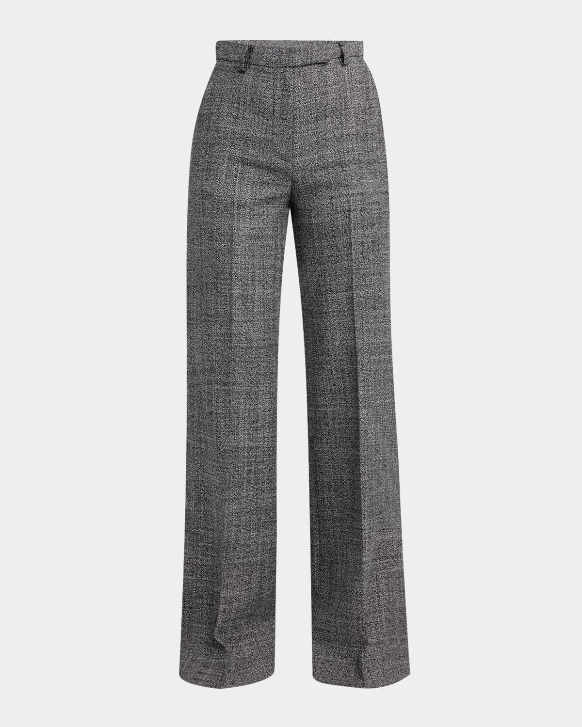 Valentino Garavani pants in textured wool High rise Flat front Side slip pockets Back welt pockets Wide legs Full length Hooktab/zip fly; belt loops Virgin wool Made in Italy