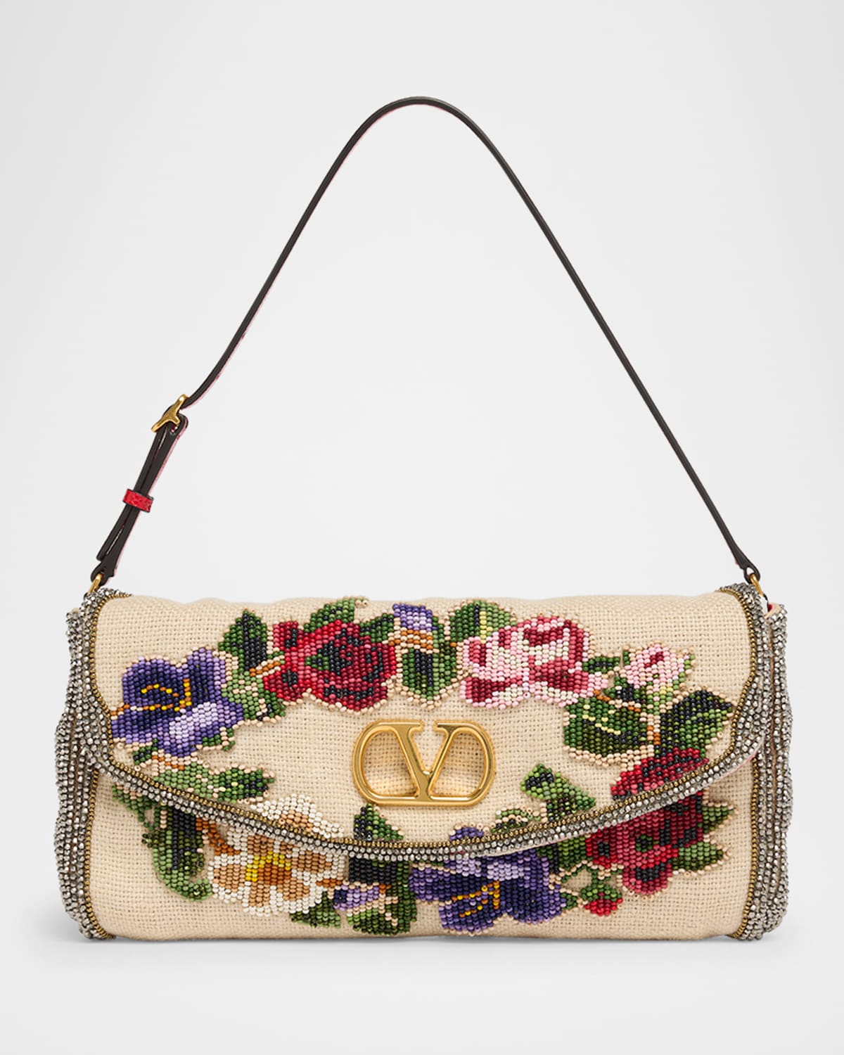 Valentino Garavani "Vain" soft clutch bag with allover beading features floral garland motifs and antiqued goldtone VLOGO accent Adjustable top handle Flap top with magnetic closure Approx. 4.7"H x 9.3"W x 1.2"D Made in Italy