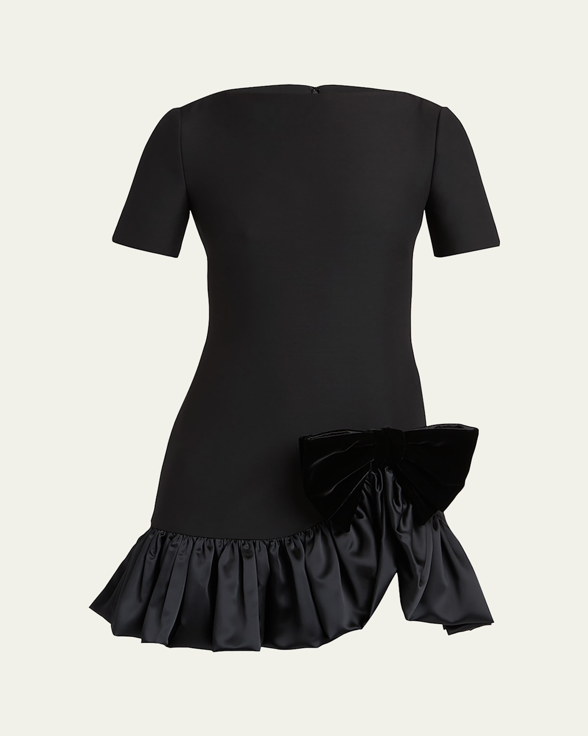 Valentino Garavani crepe dress featuring a velvet bow and a satin ruffle hem High neckline Short sleeves Sheath silhouette Mini length Invisible back zip Virgin wool/silk Made in Italy