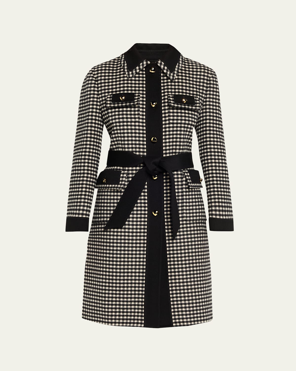 Valentino Garavani "Vichy" coat is crafted from virgin wool with a sharp black check pattern, contrast trim, and signature Vlogo buttons Point collar; singlebreasted front Long sleeves Selftie belted waist Chest and hip buttonflap pockets Straight fit Knee length Walking vent back Virgin wool Made in Italy