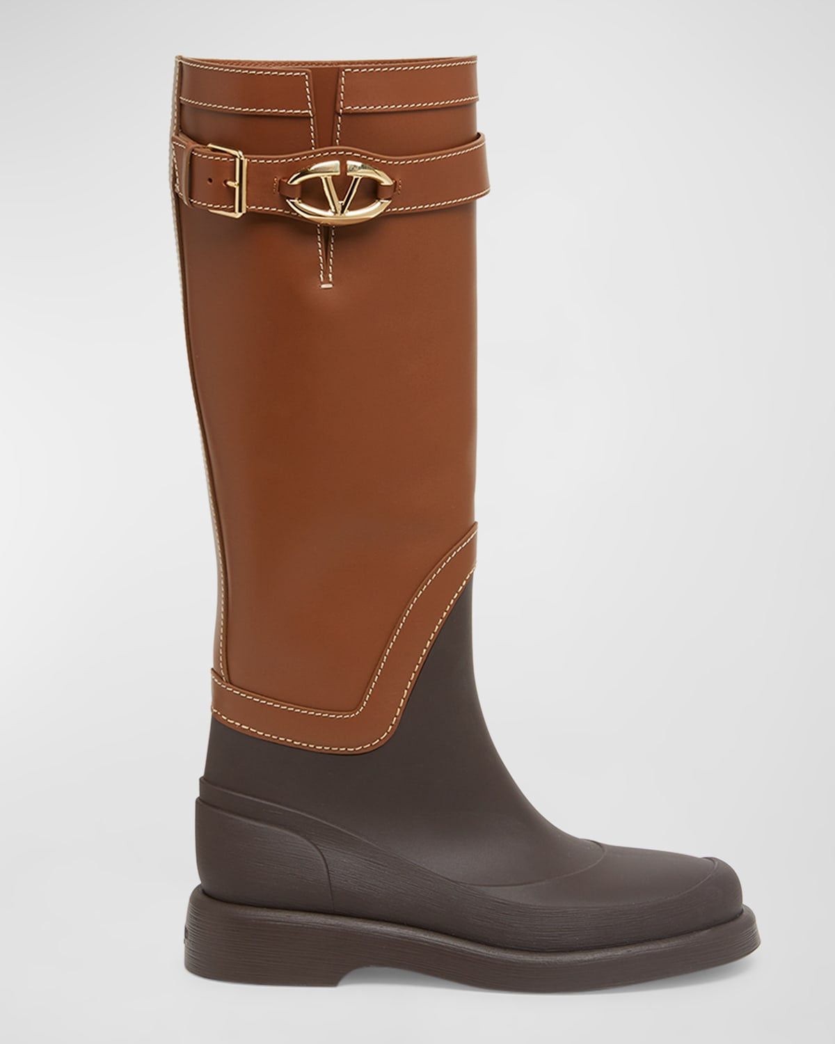 Valentino Garavani twotone leather and rubber tall rain boots V logo medallion strap at collar 1.38 in / 35 mm flat heel Round toe Pullon style Lightweight, flexible EVA outsole Lining: leather Made in Italy