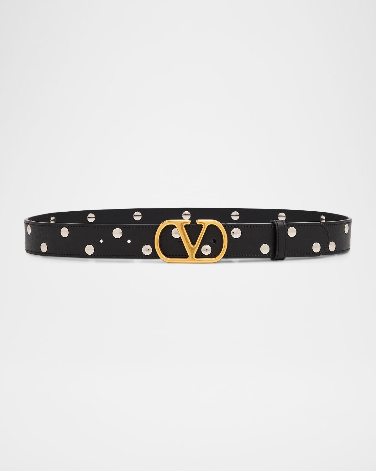 Valentino Garavani shiny calfskin leather belt studded with metal rivets for a contrasting finish Approx. 1.2"H VLogo Signature buckle in antique brass Buckle closure Leather Made in Italy