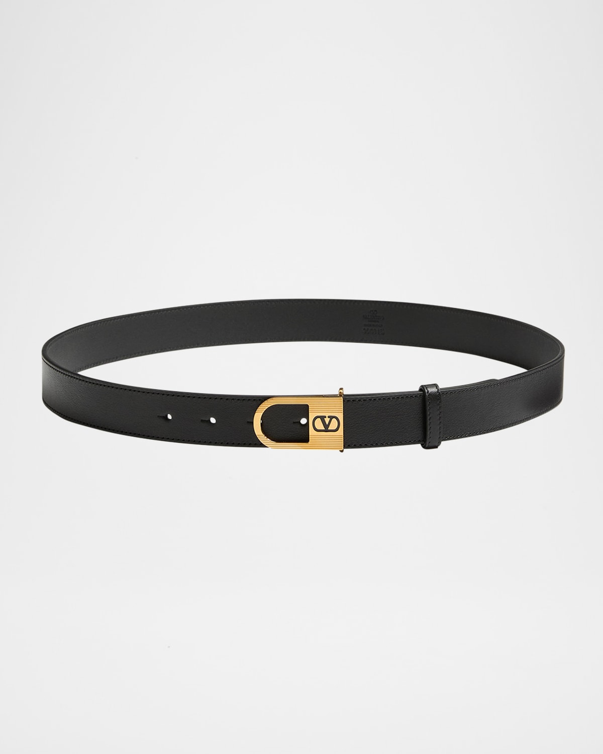 Valentino Garavani belt crafted of shiny calfskin leather Approx. 1.2"H VLogo Signature brass enameled logo Calfskin interior Buckle closure Spot clean Made in Italy