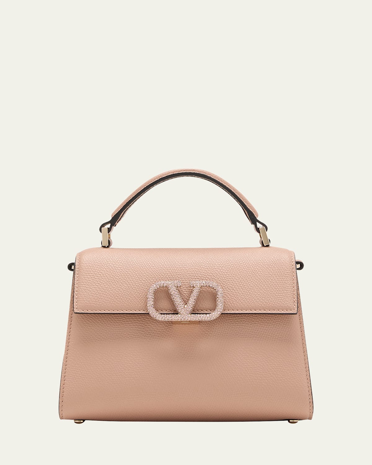 Valentino Garavani "VSLING" top handle bag in soft grainy leather and metal Top handle Detachable crossbody strap Can be worn as a top handle or crossbody bag Flap top with VLOGO rhinestone liftclasp closure Interior, one slip pocket Feet protect bottom of bag Approx. 5.5"H x 7.4"W x 3.5"D Made in Italy