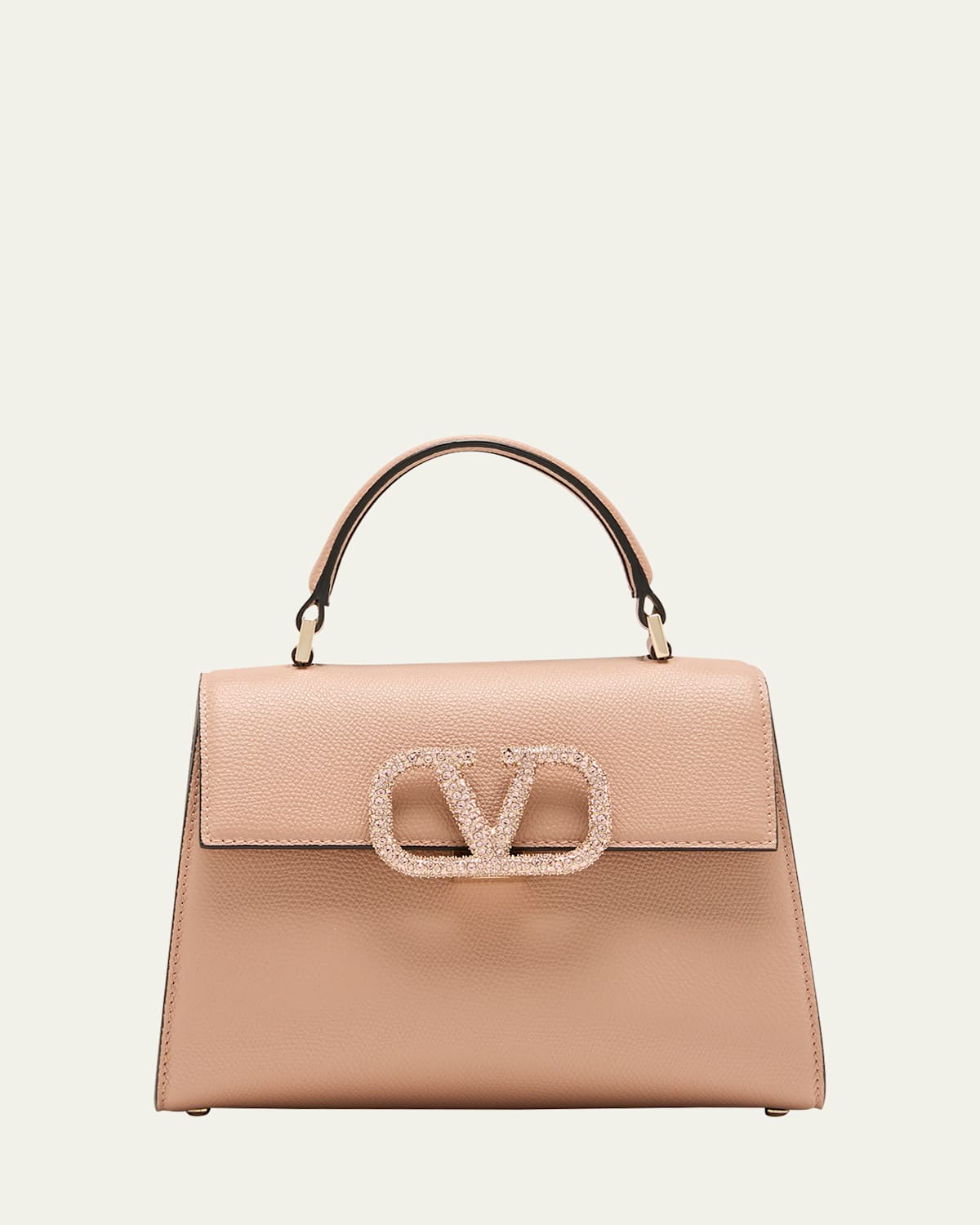 Valentino Garavani "VSLING" top handle bag in leather and brass Flat top handle Detachable, adjustable shoulder strap Can be worn as a top handle or shoulder bag Flap top with rhinestone VLOGO lift clasp closure Interior, one zip pocket Feet protect bottom of bag Approx. 6.7"H x 8.7"W x 4.7"D Made in Italy