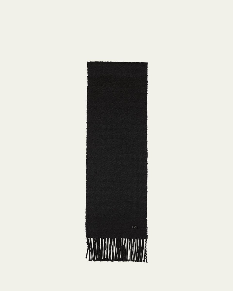 Valentino bouclé scarf in virgin wool, cashmere, and mohair Approx. 70.8"L x 11.8"W The Bold Edition Vlogo charm Fringe trim May be styled in multiple ways Made in Italy