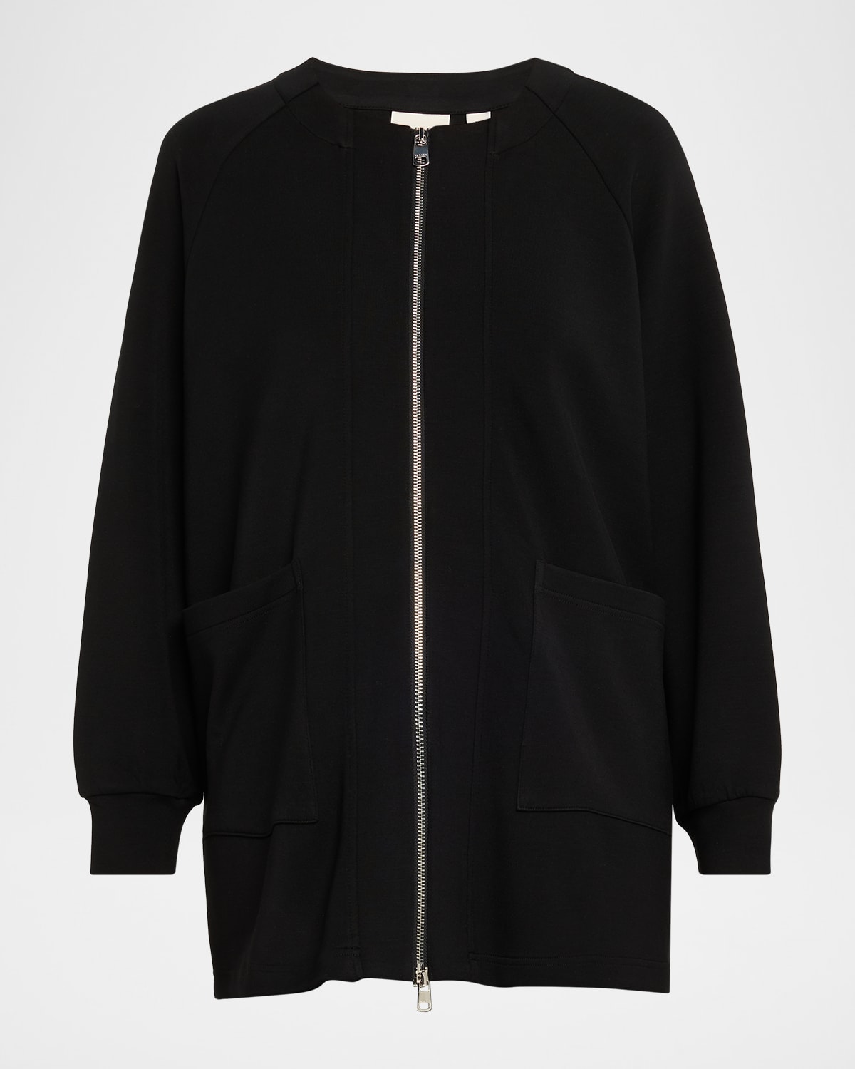 Made from signature super soft DoubleSoft® fabric, the "Augusta" jacket by Varley is perfect for layering during transitional months Approx. 24.4"L from shoulder to hem Crew neckline Long sleeves Large patch pockets Oversized fit Longline silhouette Twoway front zipper Viscose/polyester/elastane Imported