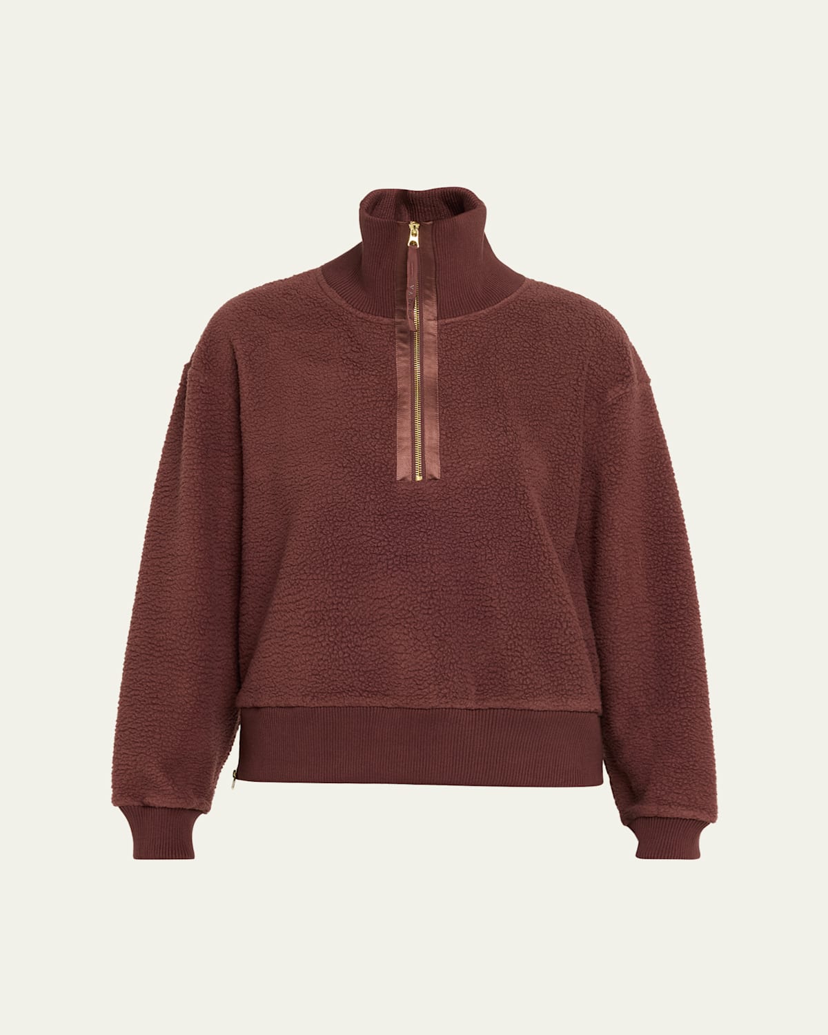 Varley "Roselle" fleece sweatshirt Stand collar; halfzip front Dropped shoulders Long sleeves Relaxed fit Ribbed cuffs and hem Pullover style Recycled polyester Imported