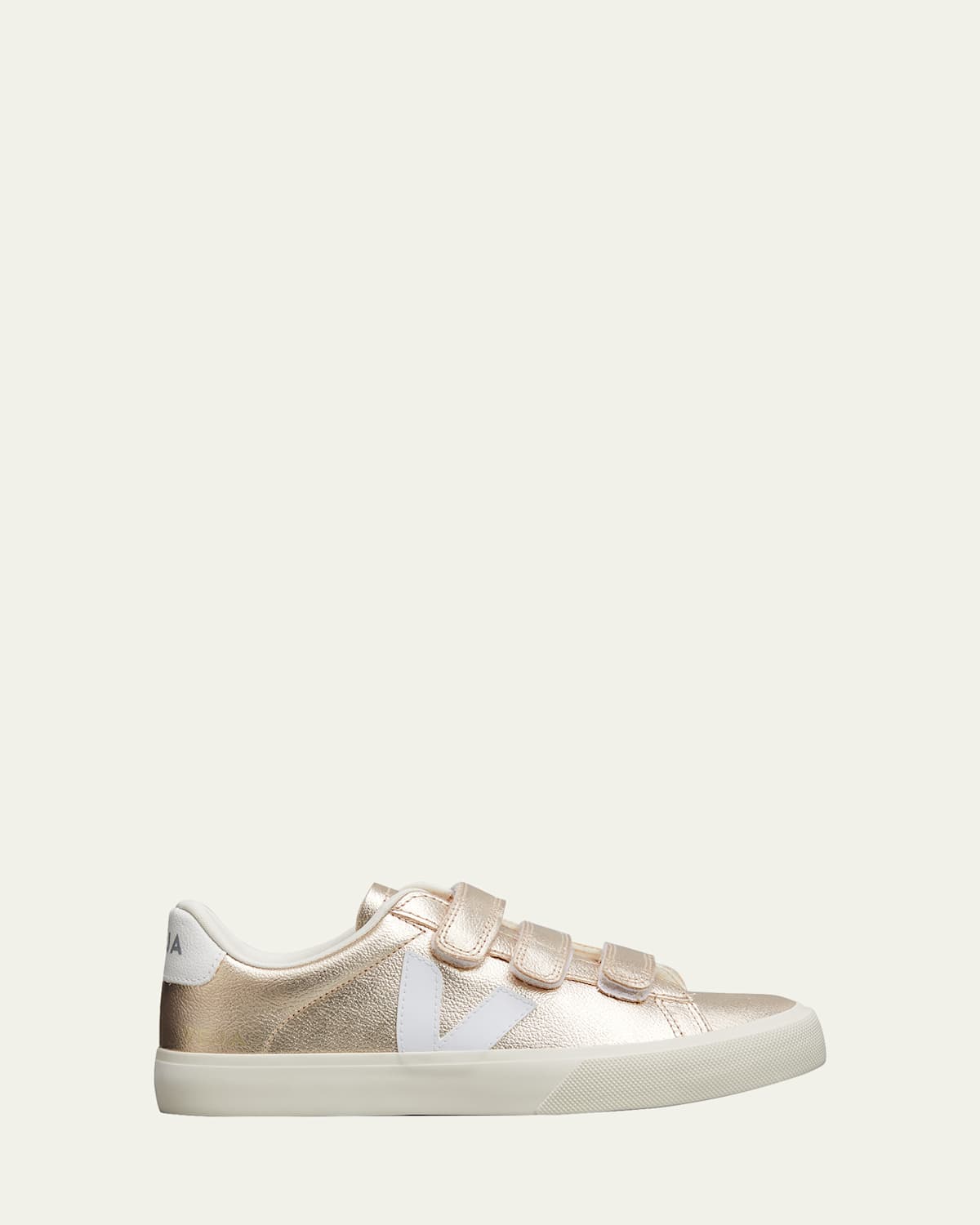 VEJA "Recife" matte and metallic leather lowtop court sneakers. 1" flat heel. Round toe. Triple grip strap vamp. Cushioned footbed. Rubber sole. Made in Brazil.
