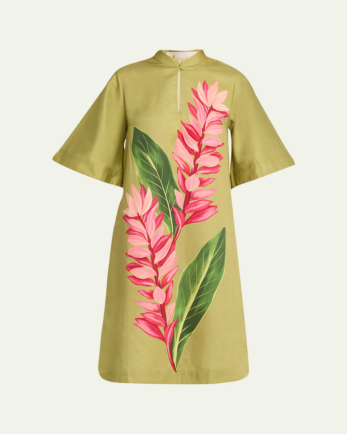 Verandah kaftanstyle shirtdress printed with a floral graphic Mandarin collar; single button/loop closure Relaxed elbowlength sleeves Mini side slits Curved hem falls above the knee Slipover style Cotton Imported