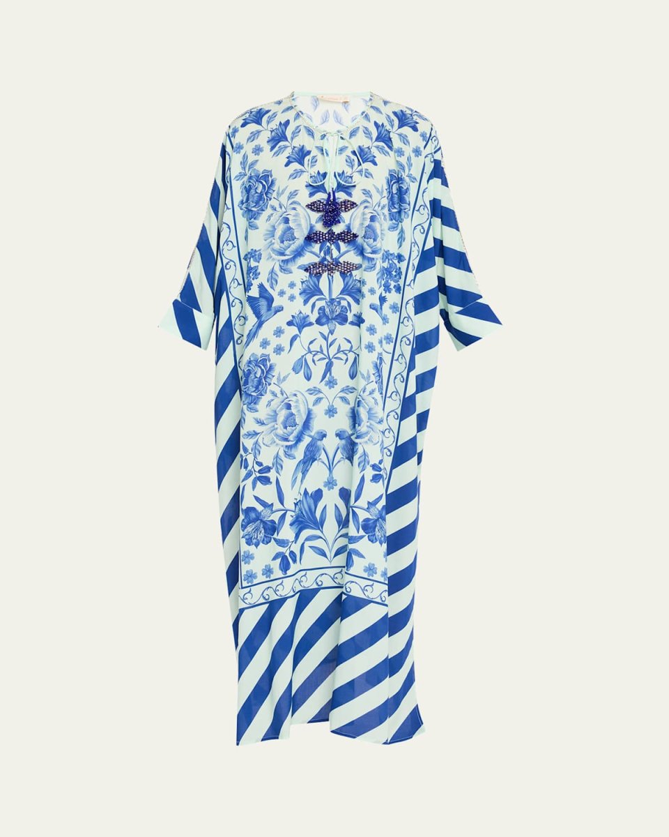Verandah kaftanstyle dress printed wiht peonies and striped with tonal handbeaded detailing V neckline with optional selfties 3/4 batwing sleeves Full length Relaxed fit Slipover style Viscose Imported