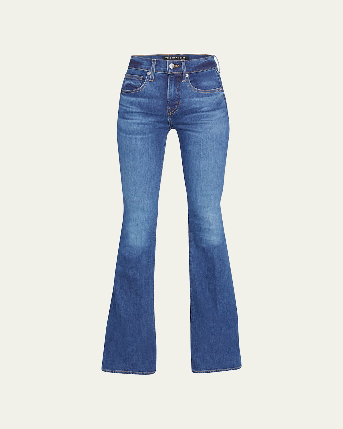 Veronica Beard Jeans "Beverly" jeans in medium wash denim Approx. measurements: 35" inseam; 21" leg opening; 11 1/4" front rise; 15" back rise (size 29) Full length Flat front High rise Fivepocket style Fitted through hip; flared from knee Button/zip fly; belt loops Machine wash Made in USA from imported materials