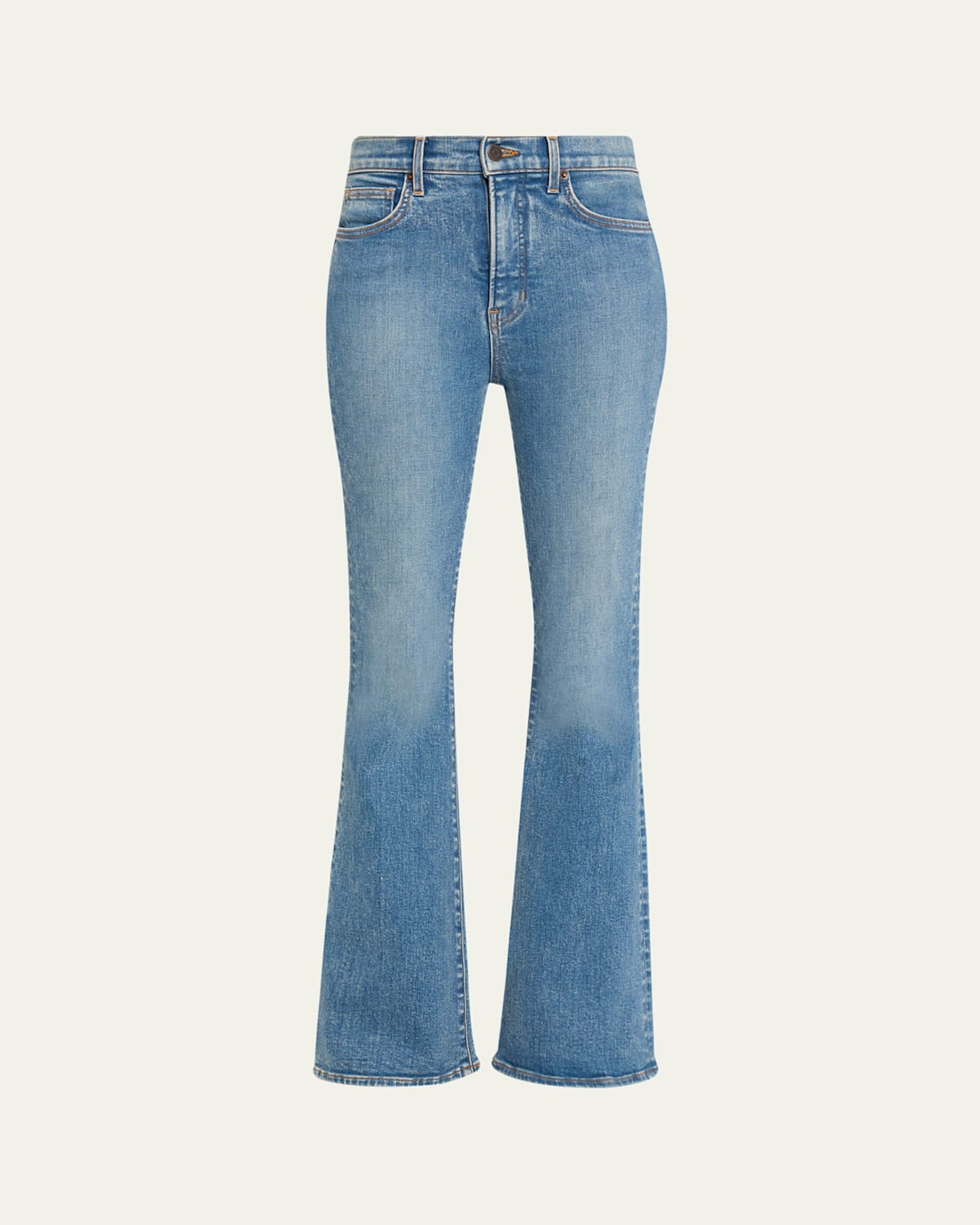 Veronica Beard "Beverly" flare jeans in faded mediumwash stretchdenim Approx. 11" rise; 30" inseam High rise Fivepocket style Slim fit Ankle length Button/zip fly; belt loops Cotton/elastane Machine wash cold inside out Made in USA