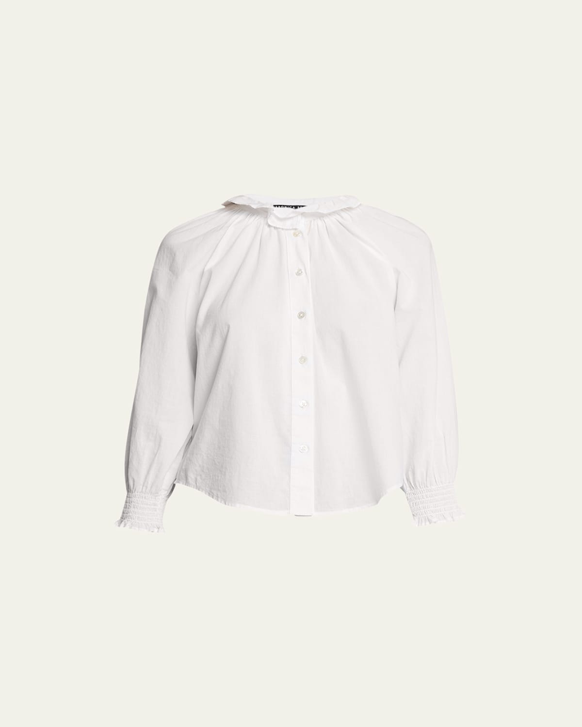 Veronica Beard Jeans "Calisto" cotton buttonfront shirt featuring a ruffled stand collar Pleated neckline Long sleeves; smocked cuffs Classic fit Rounded hem Cotton Imported