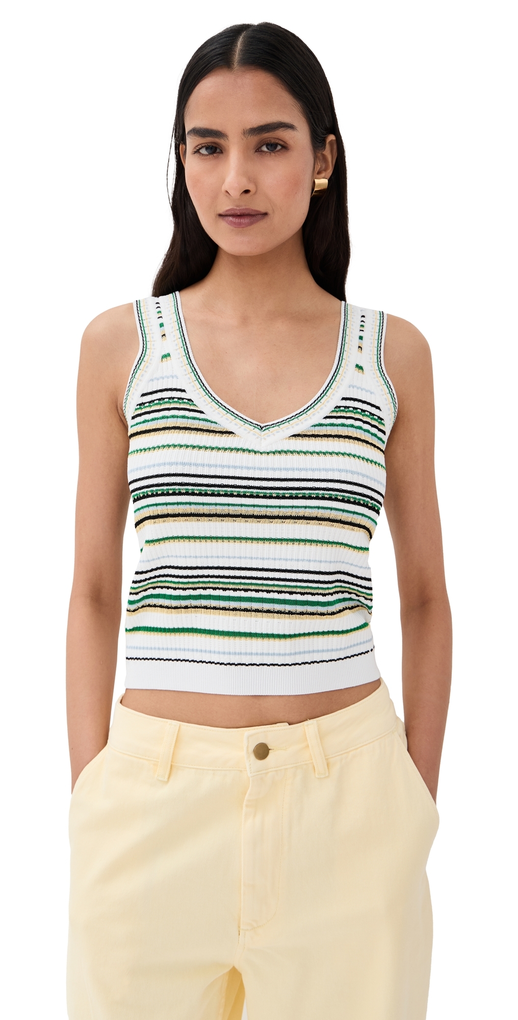 Fabric: Lightweight ribbed knit. Stripe pattern. V neck. Sleeveless. Shell: 84% viscose/16% polyester. Dry clean. Imported, China. Measurements: Measurements from size XS Length: 18in / 46.0cm, from shoulder