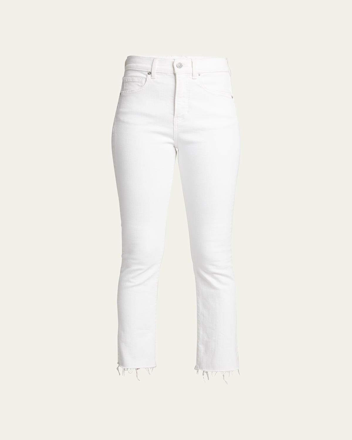 Veronica Beard Jeans "Carly" jeans in stretch denim Approx. measurements: 11.3" rise; 26" inseam; 26" outseam Fivepocket style High rise Slim fit; narrow flare from the knee Cropped at the ankle Frayed rawedge hem Button/zip fly; belt loops Cotton/polyester/spandex Machine wash Made in USA from imported materials Size Note: Height: 5'9"/ waist 24"/ hips 36"/ bust 32" Model is wearing size 25